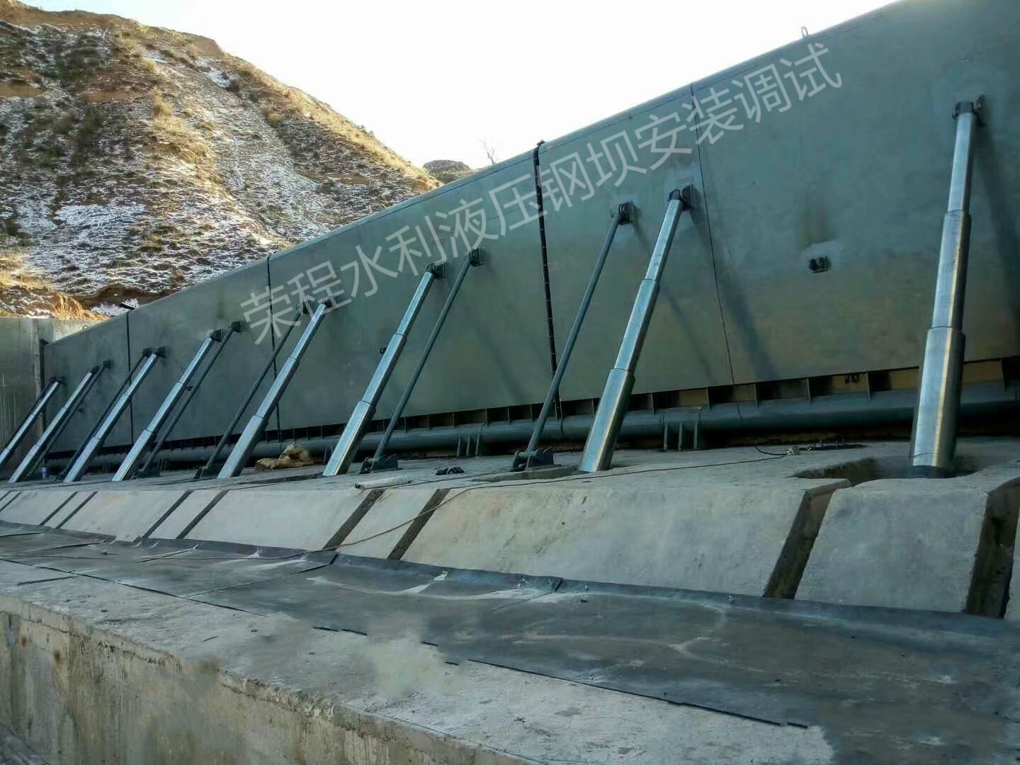 液壓翻板閘門的構造由弧形(或直線)壩面、液壓桿、支撐桿、液壓缸和液壓泵站組成。